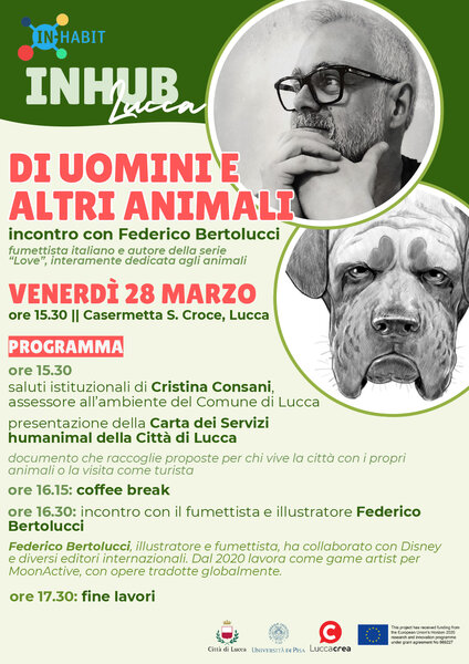 Proprio nell’ambito di questa iniziativa è stato organizzato un incontro che unisce due delle anime che caratterizzano la città – attenzione per gli animali e storica promozione della Nona Arte – coinvolgendo il noto fumettista e illustratore Federico Bertolucci. L’appuntamento DI UOMINI E ALTRI ANIMALI previsto per venerdì 28 marzo a partire dalle ore 15:30 (c/o Casermetta Santa Croce – Lucca), sarà l’occasione per approfondire il progetto INHABIT e le iniziative pet-friendly ma anche per dialogare con l’acclamato artista, che ha dedicato un’intera serie di libri, Love, al mondo animale. L’opera è valsa all’autore il Gran Guinigi, premio speciale della giuria a Lucca Comics & Games nel 2011, e la medaglia d’oro nella categoria miglior Graphic Novel per gli Indipendent Publisher Book Award 2016 a Chicago.