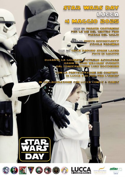 Grazie al Comune di Lucca e a Lucca Crea, lo “Star Wars Day” sarà celebrato in stile Lucca Comics & Games, richiamando in città tutti i più importanti gruppi ufficiali italiani e internazionali della Saga che daranno vita ai personaggi tanto amati, e grazie alla collaborazione dei musicisti dell’orchestra del Conservatorio “L. Boccherini” ci sarà anche la possibilità di ascoltare la colonna sonora e le musiche che hanno accompagnato i momenti salienti di Luke Skywalker e degli altri protagonisti, realizzate dal compositore John Williams. Grande attesa poi anche per la partecipazione delle principali community che si daranno appuntamento in città.